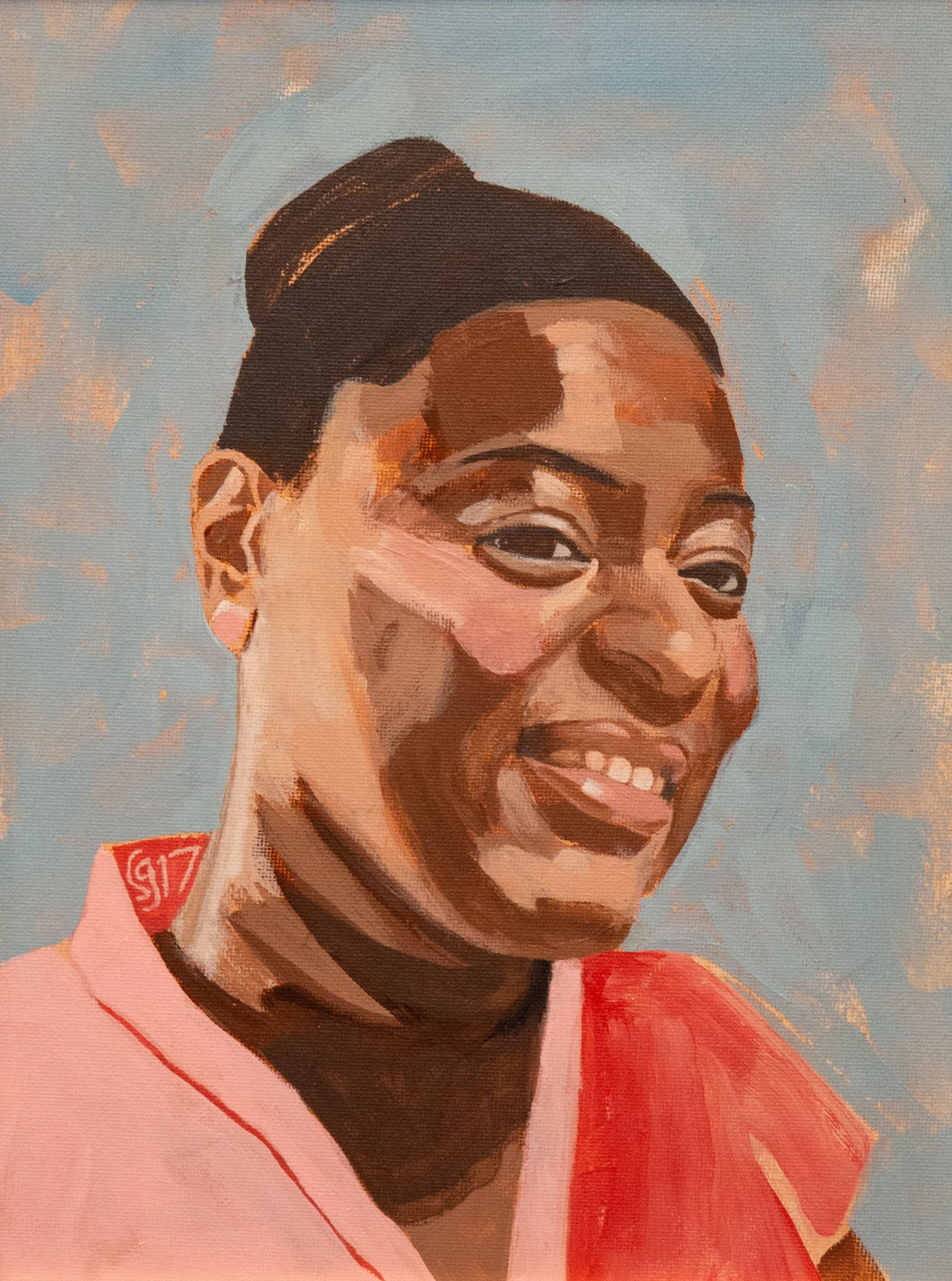 I feel that my strength is having a face appear animated even though I work from photographs. Rather than smoothing the paint over, I like to show dynamic brushstrokes. This also produces a livelier effect. I use my paintbrush rather than a drawing implement from the very beginning of the process to lay out the basic shapes and this helps retain a sense of spontaneity.